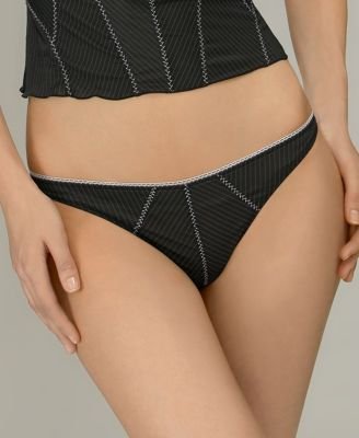 This semi-sheer Jezebel thong features pinstripes accented with white stitching. It has a high-cut leg and offers traditional thong back coverage.